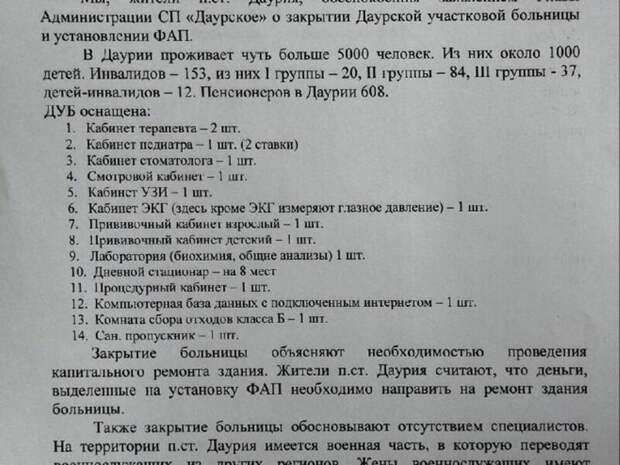 «Также закрытие больницы объясняют отсутствием специалистов, - пишут жители села. – На территории пос. Даурия имеется военная часть, в которую переводят военнослужащих из других регионов. Жены военнослужащих имеют медицинское образование. Имеется возможность привлекать специалистов из данного контингента».