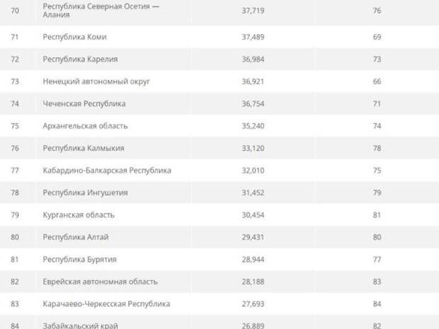 В пятёрку худших регионов вошли Республика Бурятия, Еврейская автономная область, Карачаево-Черкесская Республика, Забайкальский край и Республика Тыва.