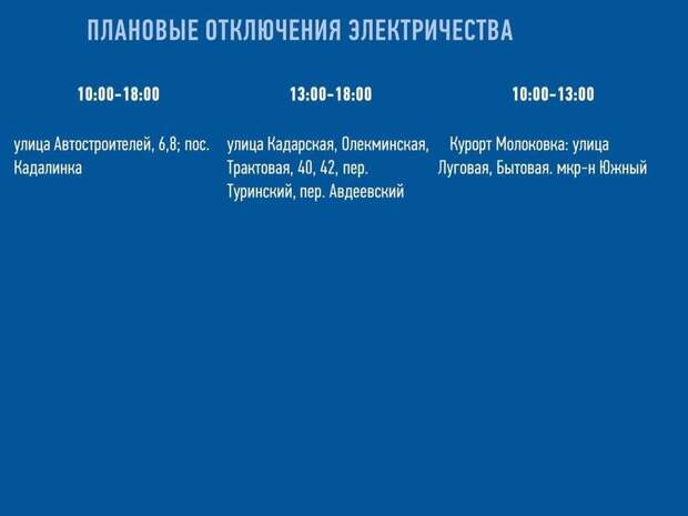 с 13:00 до 18:00 — улица Кадарская, Олекминская, Трактовая, 40, 42; переулки Туринский и Авдеевский.