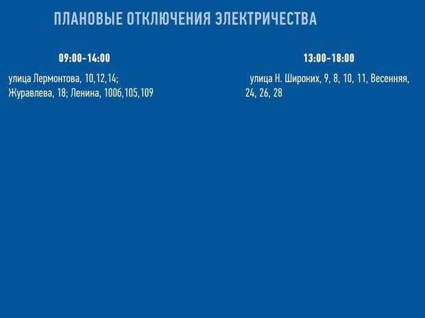 с 09:00 до 14:00 — улица Лермонтова 10, 12, 14; Ленина 100б, 105, 109.