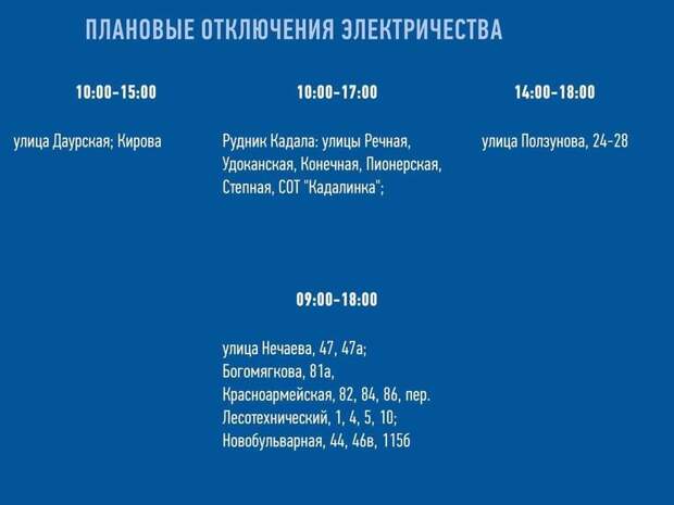 с 10:00 до 17:00 — Рудник Кадала, улицы Речная, Удоканская, Конечная, Пионерская, Степная, СОТ «Кадалинка».