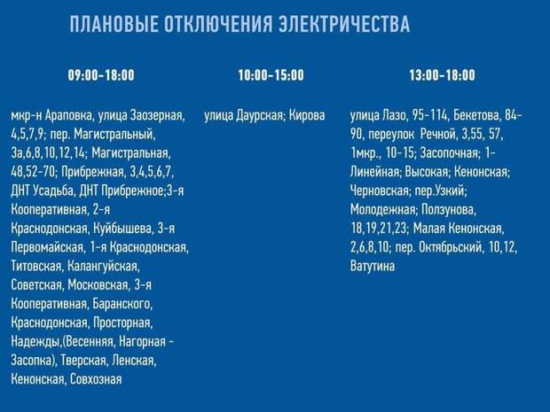 с 09:00 до 18:00 — микрорайон Араповка, Заозёрная 4, 5, 7, 9; переулок Магистральный, 3а, 6, 8, 10, 12,14, Магистральная 48, 52-70; Прибрежная 3, 4, 5, 6, 7; ДНТ Усадьба, ДНТ Прибрежное; З-я Кооперативная, 2-я Краснодонская, Куйбышева, 3-я Первомайская, 1-я Краснодонская, Титовская, Калангуйская, Советская, Московская, 3-я Кооперативная, Баранского, Краснодонская, Просторная, Надежды,(Весенняя‚ Нагорная - Засопка),Тверская,Ленская,Кенонская, Совхозная.