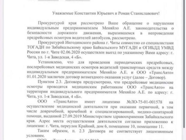 В результате рейда, проведенного Забайкальской прокуратурой, выявлено, что у двух машин парка не был пройден предрейсовый технический контроль. Об этом 16 июня ZAB.RU сообщили депутаты члены КПРФ Роман Берг и Константин Коростелёв, по просьбе которых была проведена проверка, её результаты депутаты предоставили ZAB. RU